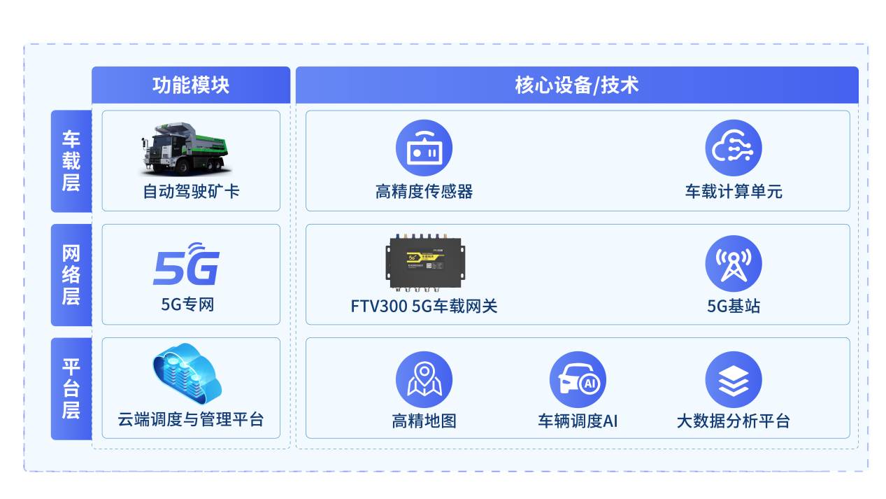 網(wǎng)絡(luò)層:構(gòu)建5G專網(wǎng)覆蓋礦區(qū),通過四信5G車載網(wǎng)關(guān)FTV300實現(xiàn)車-云雙向數(shù)據(jù)超低時延傳輸,配合5G基站形成冗余通信鏈路,保障關(guān)鍵指令永不中斷。