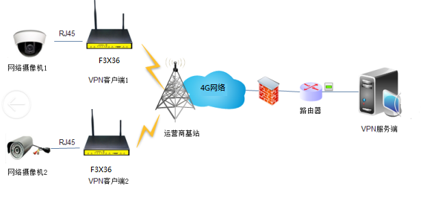通過搭建廈門四信路由器建立VPN通道的方式來實現(xiàn)兩端子網(wǎng)的數(shù)據(jù)通信,F(xiàn)3X36通過無線網(wǎng)絡(luò)連接上VPN服務(wù)端后,效果等同于兩邊計算機(jī)在一個局域網(wǎng)下傳輸數(shù)據(jù)。這樣網(wǎng)絡(luò)攝像機(jī)端的視頻信號就能通過網(wǎng)絡(luò)傳輸?shù)椒?wù)器端,可進(jìn)行實時查看,視頻存儲等應(yīng)用。